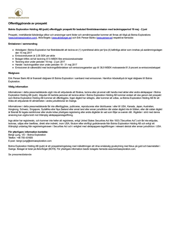Prospekt, innehållande fullständiga villkor och anvisningar samt folder och anmälningssedlar kommer att finnas att tillgå på Botnia Explorations (www.botniaexploration.com), AktieTorgets (www.aktietorget.se) och Erik Penser Banks (www.penser.se) respektive hemsidor.