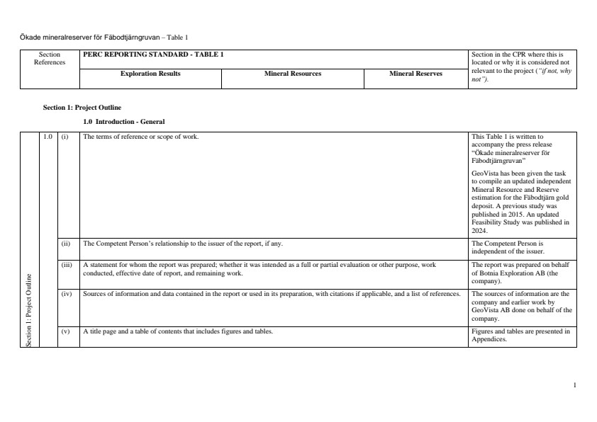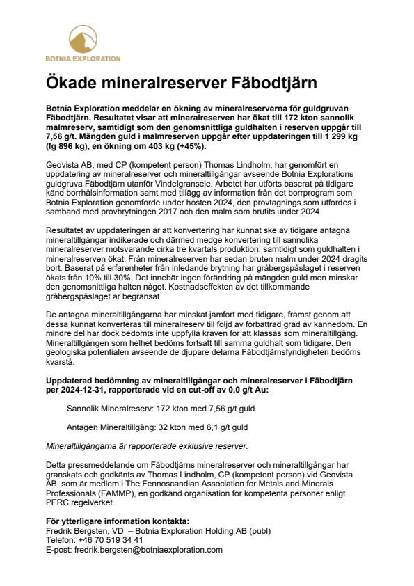 Geovista AB, med CP (kompetent person) Thomas Lindholm, har genomfört en uppdatering av mineralreserver och mineraltillgångar avseende Botnia Explorations guldgruva Fäbodtjärn utanför Vindelgransele. Arbetet har utförts baserat på tidigare känd borrhålsinformation samt med tillägg av information från det borrprogram som Botnia Exploration genomförde under hösten 2024, den provtagnings som utfördes i samband med provbrytningen 2017 och den malm som brutits under 2024.