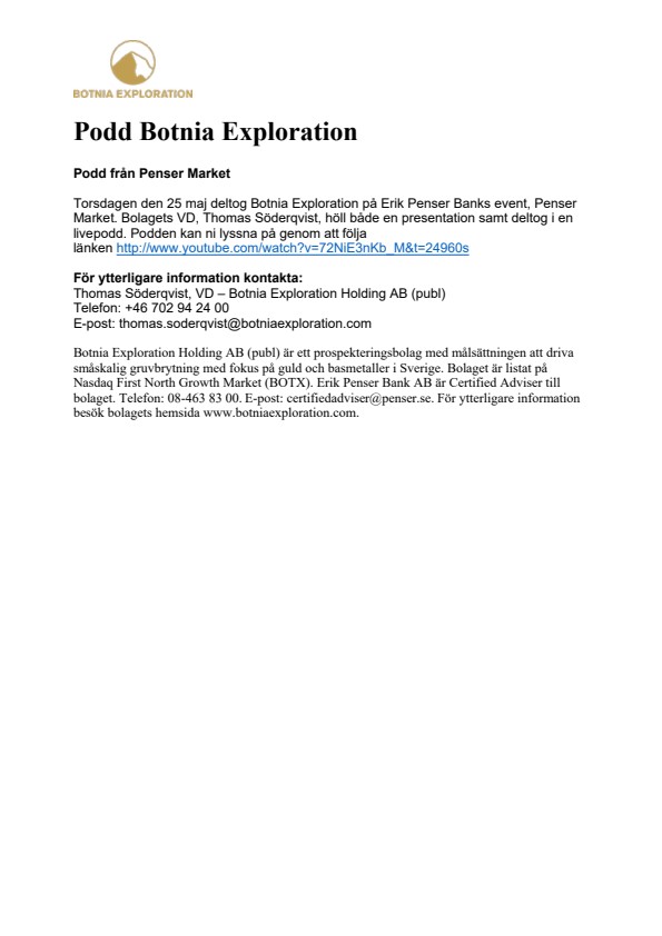 Torsdagen den 25 maj deltog Botnia Exploration på Erik Penser Banks event, Penser Market. Bolagets VD, Thomas Söderqvist, höll både en presentation samt deltog i en livepodd. Podden kan ni lyssna på genom att följa länken https://www.youtube.com/watch?v=72NiE3nKb_M&t=24960s