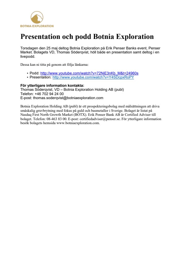 Torsdagen den 25 maj deltog Botnia Exploration på Erik Penser Banks event, Penser Market. Bolagets VD, Thomas Söderqvist, höll både en presentation samt deltog i en livepodd.