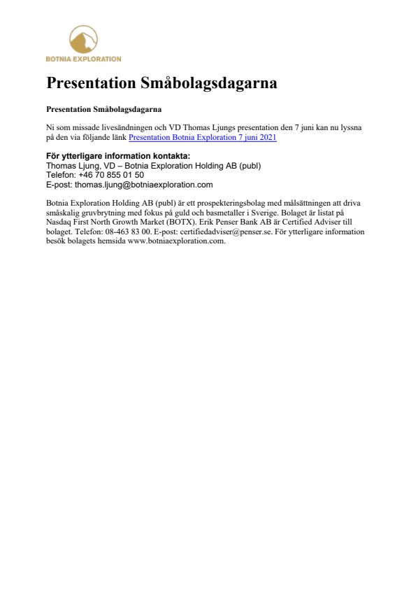 Ni som missade livesändningen och VD Thomas Ljungs presentation den 7 juni kan nu lyssna på den via följande länk Presentation Botnia Exploration 7 juni 2021