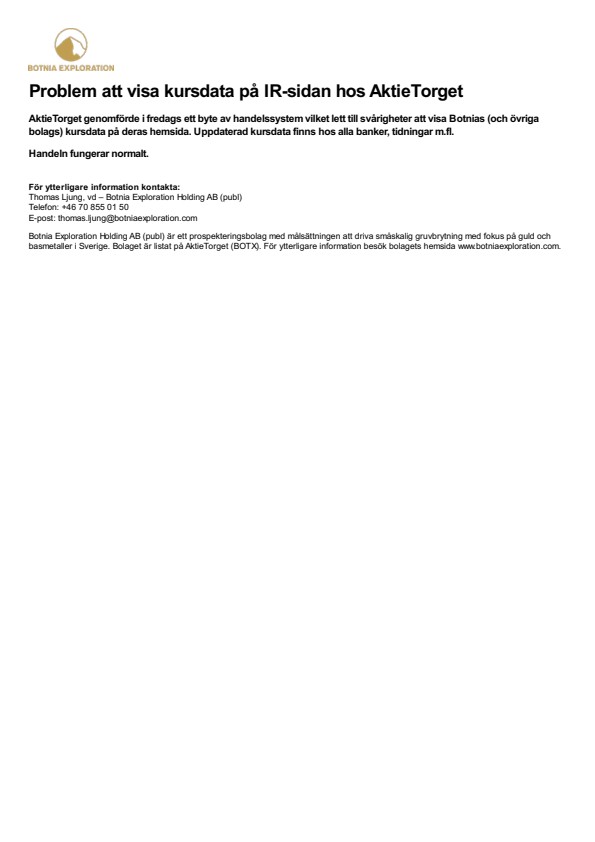 AktieTorget genomförde i fredags ett byte av handelssystem vilket lett till svårigheter att visa Botnias (och övriga bolags) kursdata på deras hemsida. Uppdaterad kursdata finns hos alla banker, tidningar m.fl.