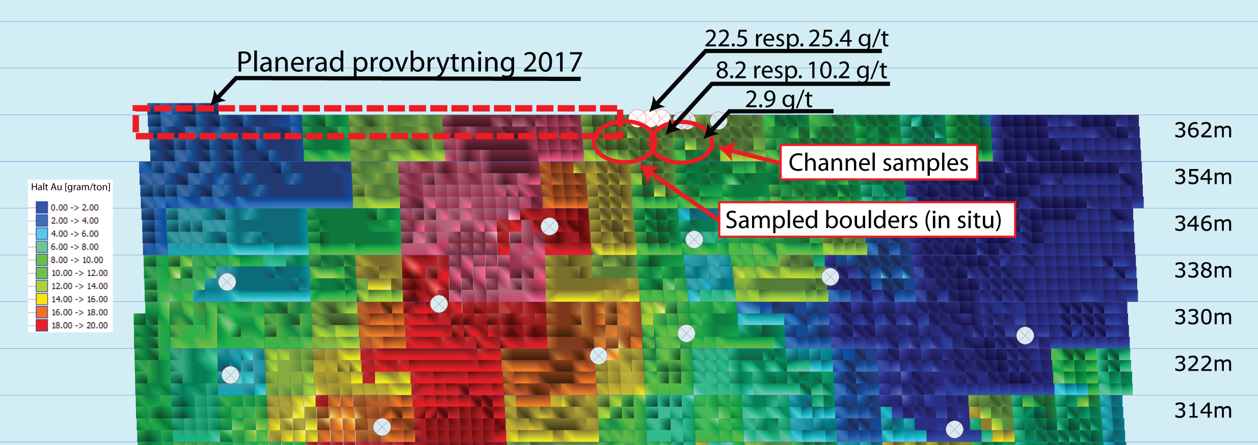 Nedanstående längdprofil visar positioner och uppmätta guldhalter från tidigare diamantborrhål (vit punkt), resultat från provanrikningen samt utsträckningen av den pågående provbrytningen.