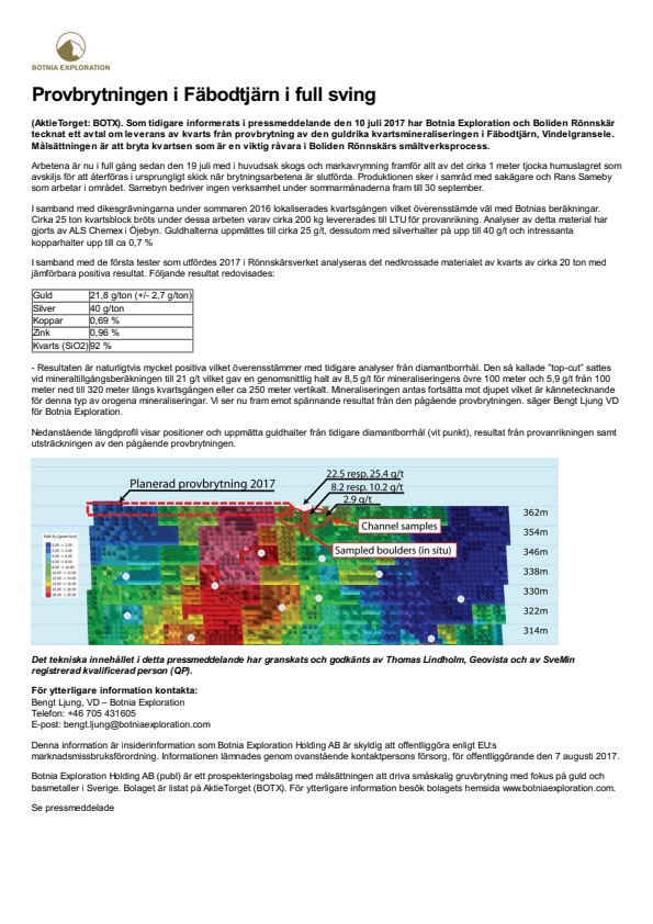 (AktieTorget: BOTX). Som tidigare informerats i pressmeddelande den 10 juli 2017 har Botnia Exploration och Boliden Rönnskär tecknat ett avtal om leverans av kvarts från provbrytning av den guldrika kvartsmineraliseringen i Fäbodtjärn, Vindelgransele.  Målsättningen är att bryta kvartsen som är en viktig råvara i Boliden Rönnskärs smältverksprocess.