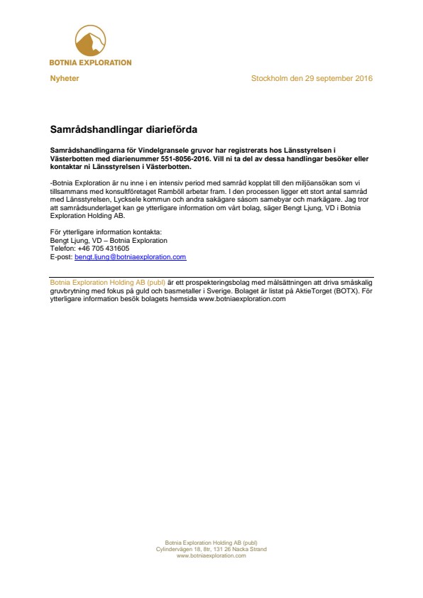 -Botnia Exploration är nu inne i en intensiv period med samråd kopplat till den miljöansökan som vi tillsammans med konsultföretaget Ramböll arbetar fram. I den processen ligger ett stort antal samråd med Länsstyrelsen, Lycksele kommun och andra sakägare såsom samebyar och markägare. Jag tror att samrådsunderlaget kan ge ytterligare information om vårt bolag, säger Bengt Ljung, VD i Botnia Exploration Holding AB.