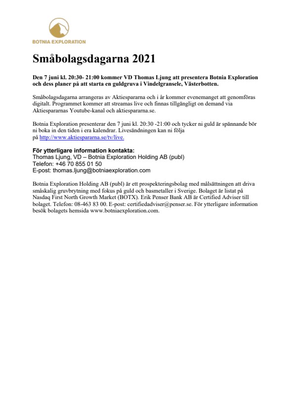 Botnia Exploration presenterar den 7 juni kl. 20:30 -21:00 och tycker ni guld är spännande bör ni boka in den tiden i era kalendrar. Livesändningen kan ni följa på http://www.aktiespararna.se/tv/live.