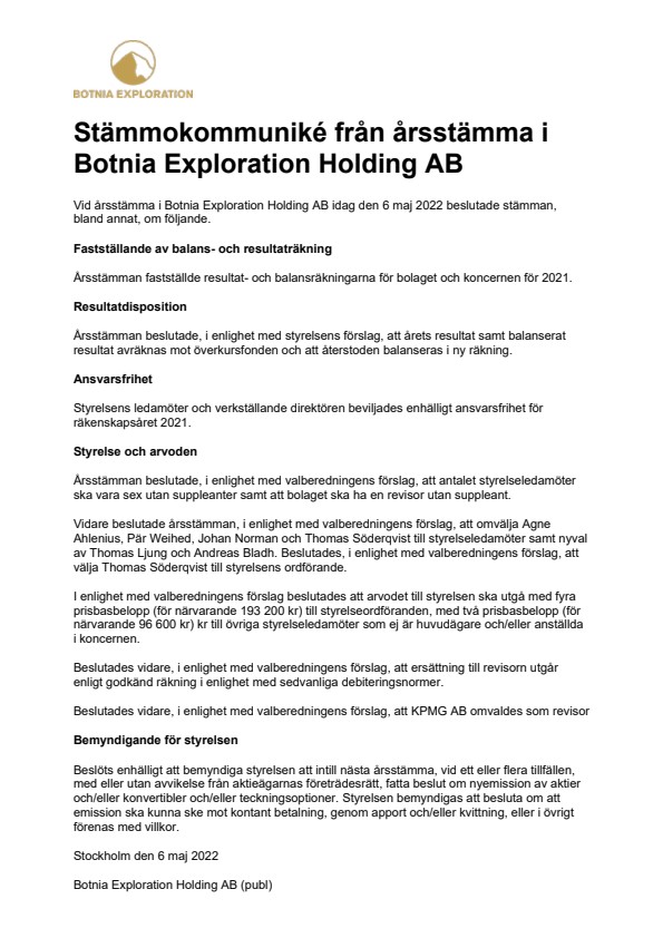 Årsstämman fastställde resultat- och balansräkningarna för bolaget och koncernen för 2021.