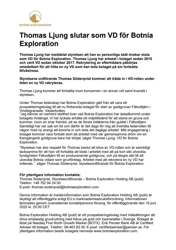 ”Jag känner en oerhörd stolthet över vad Botnia Exploration har åstadkommit under bolagets livslängd. Vi har lyckats erhålla ett miljötillstånd för att starta en gruva och kommer, inom en snar framtid, att se de första intäkterna från guldet i Fäbodtjärn. Samtidigt har var sak sin tid och därför är det dags för mig att överlåta ledarrollen till någon med ny energi att komma in och leda det dagliga arbetet. Mitt engagemang i bolaget kommer vara fortsatt stort då arbetet med vår gemensamma dröm om en framgångsrik guldgruva bara har börjat, säger Thomas Ljung, VD för Botnia Exploration.