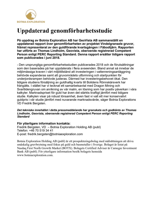 Det tekniska innehållet i detta pressmeddelande har granskats och godkänts av Thomas Lindholm, Geovista, oberoende registrerad Competent Person enligt PERC Reporting Standard