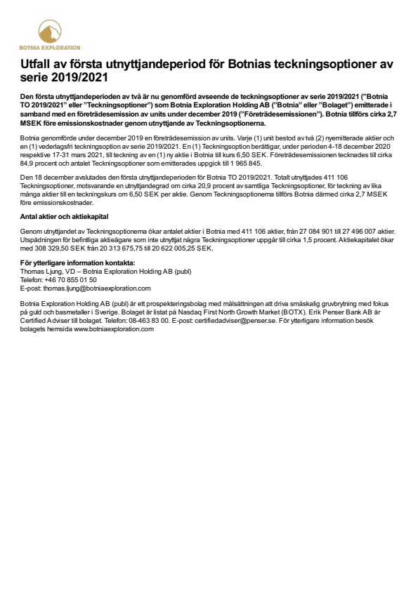 Den första utnyttjandeperioden av två är nu genomförd avseende de teckningsoptioner av serie 2019/2021 (”Botnia TO 2019/2021” eller ”Teckningsoptioner”) som Botnia Exploration Holding AB (”Botnia” eller ”Bolaget”) emitterade i samband med en företrädesemission av units under december 2019 (”Företrädesemissionen”). Botnia tillförs cirka 2,7 MSEK före emissionskostnader genom utnyttjande av Teckningsoptionerna.