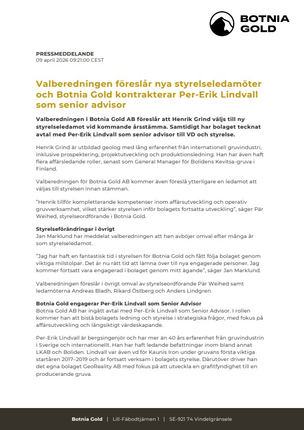 Valberedningen i Botnia Gold AB föreslår att Henrik Grind väljs till ny styrelseledamot vid kommande årsstämma. Samtidigt har bolaget tecknat avtal med Per-Erik Lindvall som senior advisor till VD och styrelse.