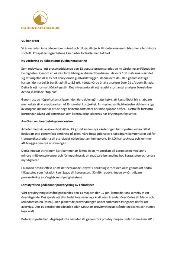 Arbetet med vår ansökan fortsätter. På grund av den nya värderingen har styrelsen också fattat beslut att inte genomföra anrikning på plats. Våra höga guldhalter i Fäbodtjärn kompenserar väl för transportkostnaderna till ett relativt närbeläget anrikningsverk. Ett LOI har tecknats och kommer att biläggas den nya ansökningen.